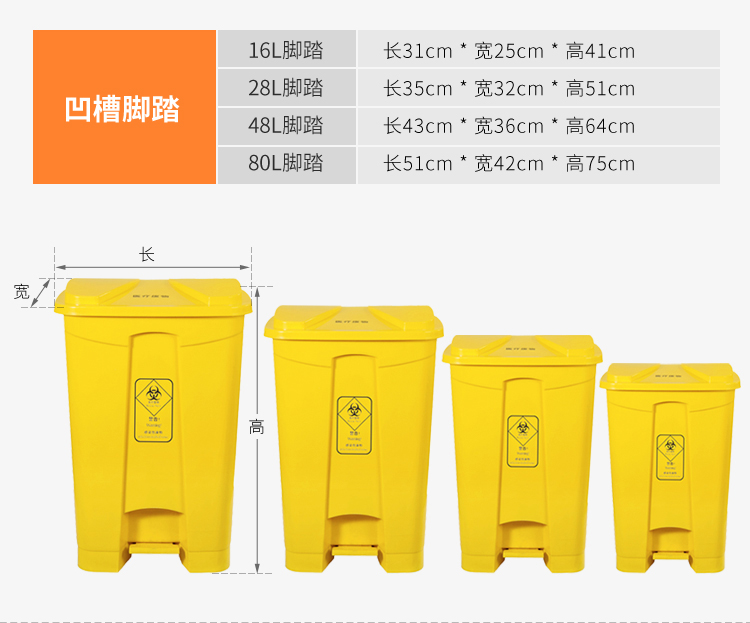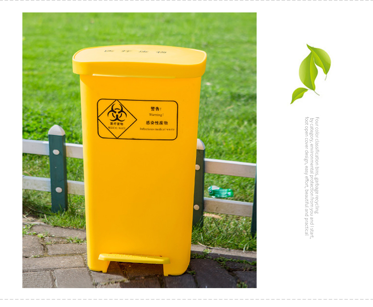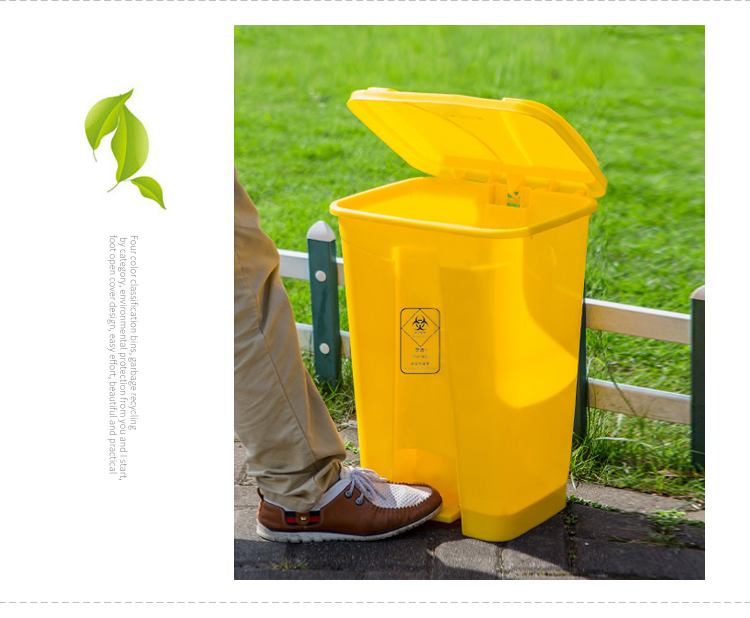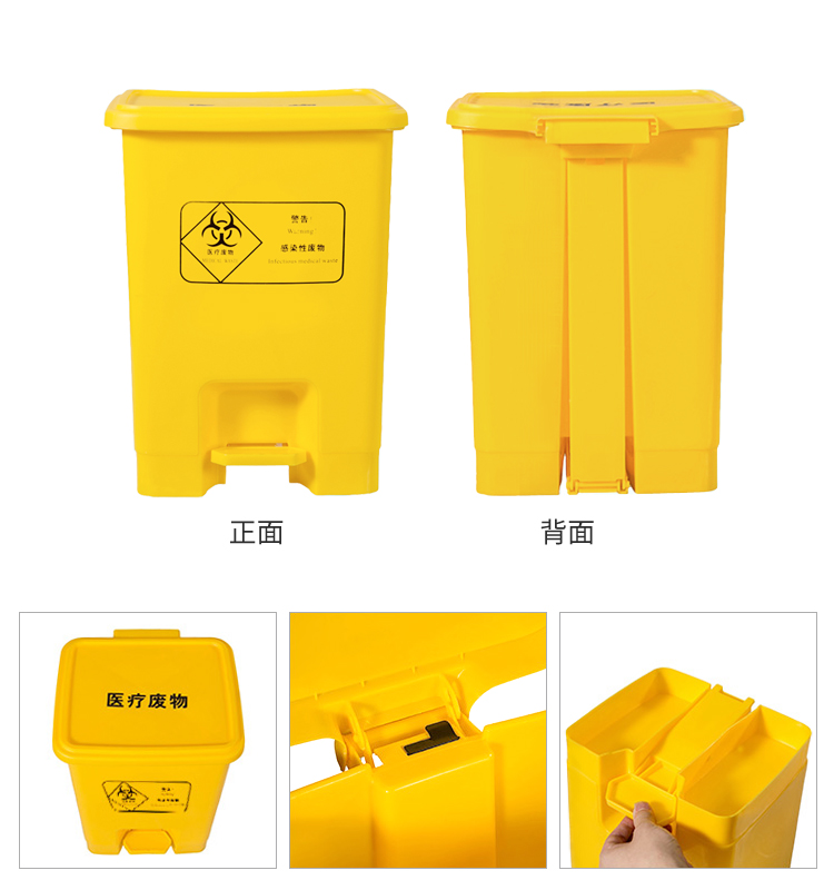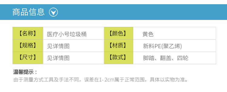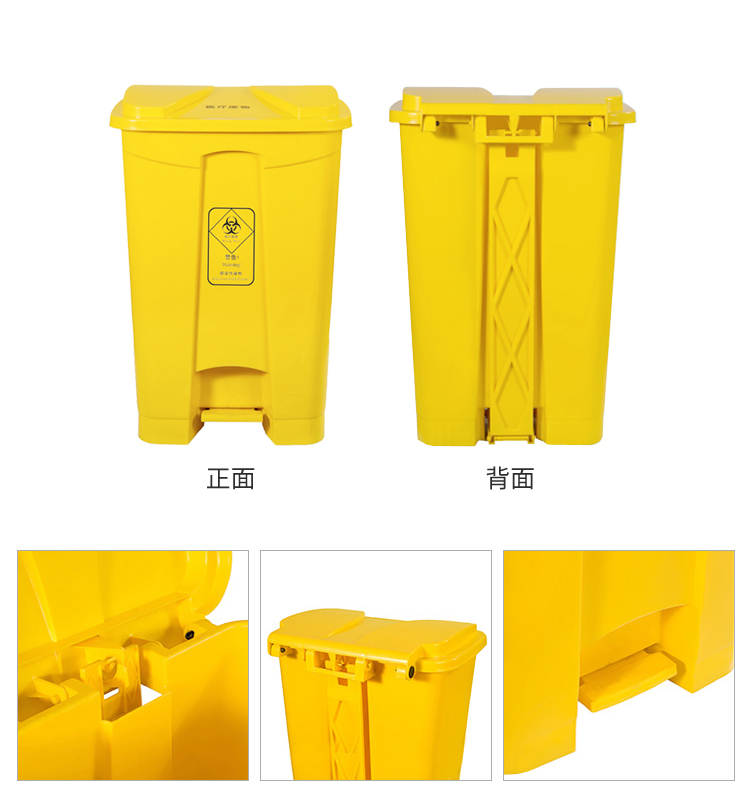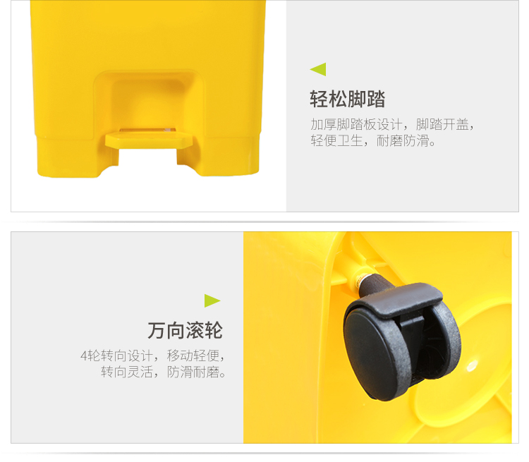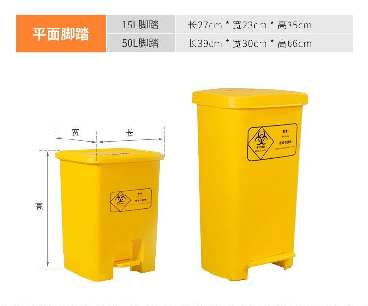 货号: XDL-50D-3 商品名称: 50L脚踏桶黄色医用垃圾桶 尺寸: 30*39*66CM 重量: 2.5KG 材质:PE