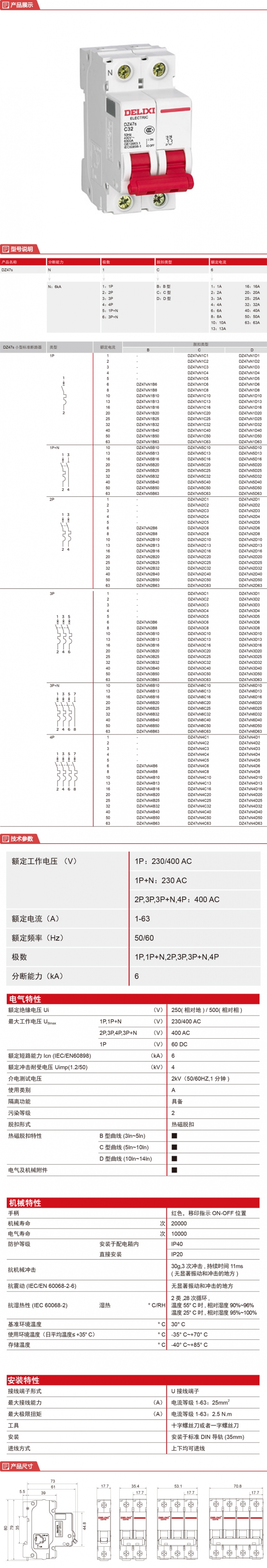 德力西 空气开关 小型断路器 DZ47s B型 1P+N 63A ;DZ47SN5B63