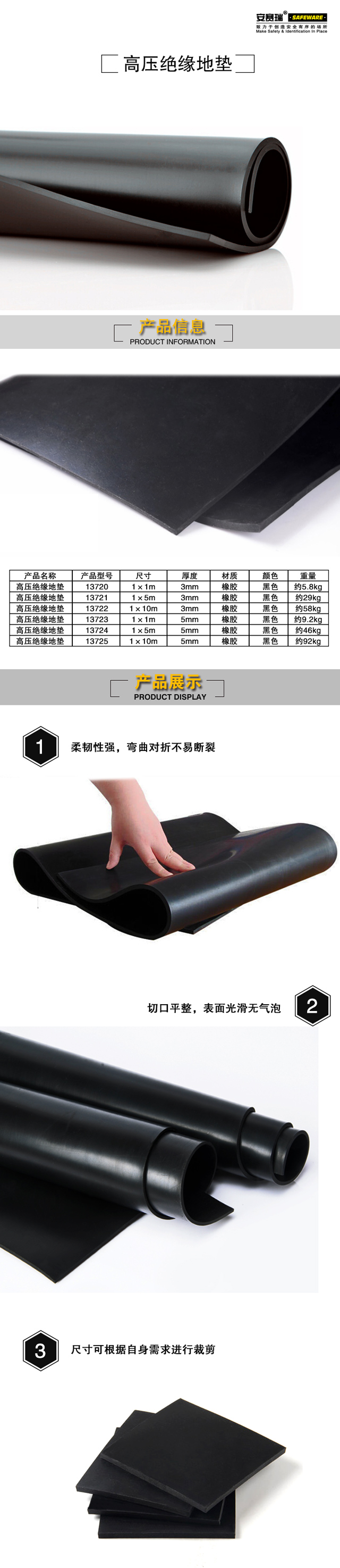安赛瑞 高压绝缘地垫 黑色 绝缘橡胶板 配电室绝缘垫 5KV(1×1m)13720
