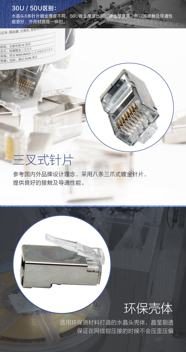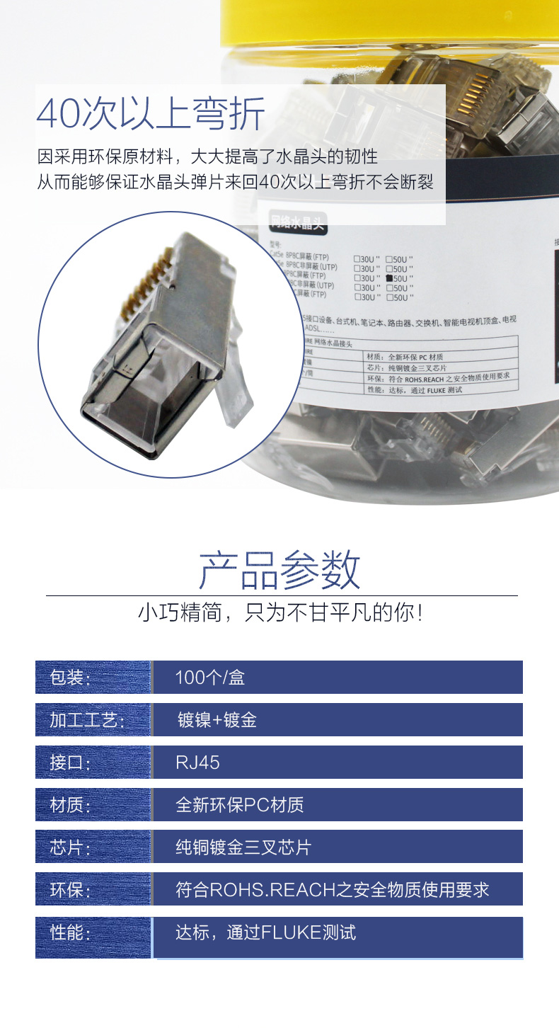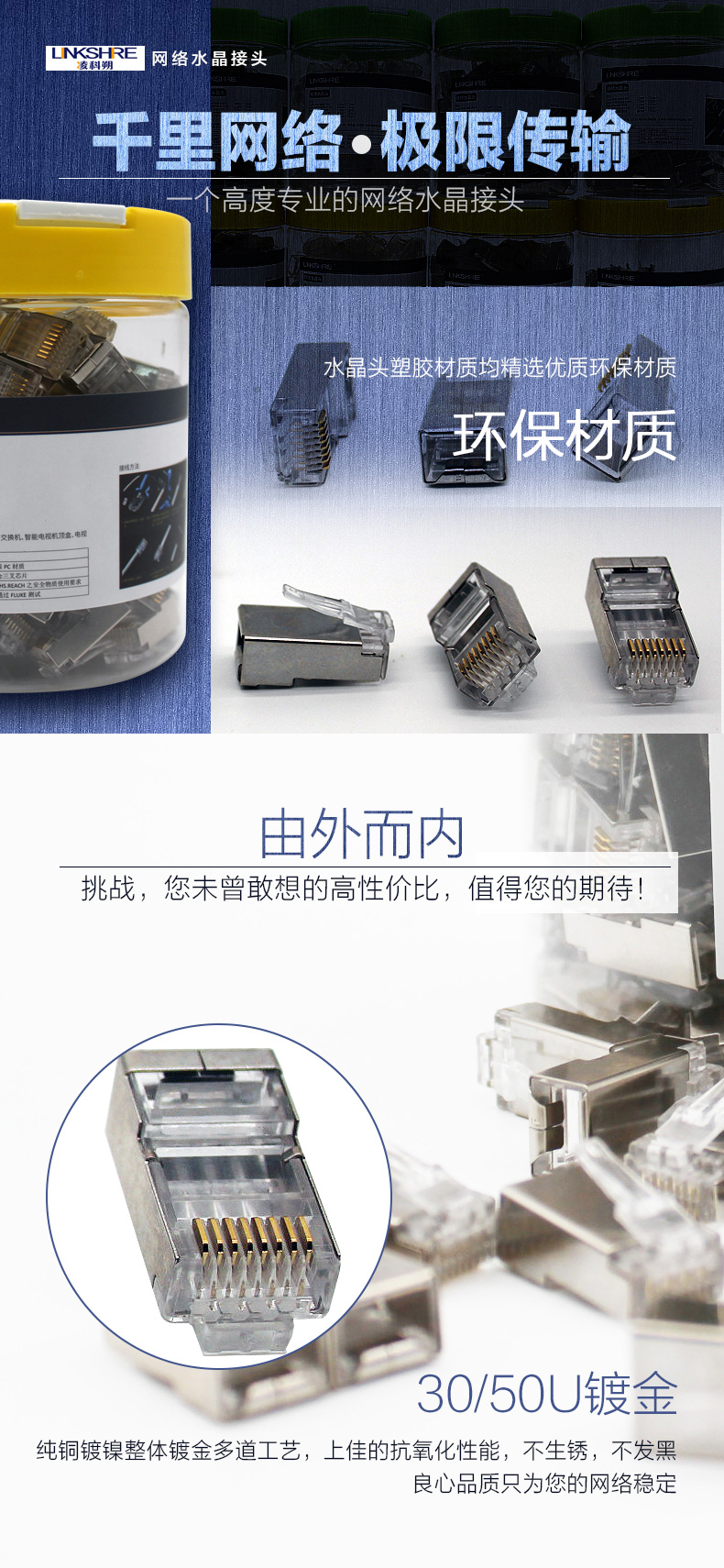 凌科朔(LINKSHIRE)六类网络水晶头 6类RJ45网络水晶头 8P8C千兆电脑网线接头 Cat6水晶头 屏蔽50u 100个装