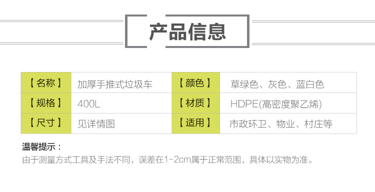 尺寸: 76*91*127CM 货号: XDL-400A-3 名称: 环卫垃圾车手推物业清洁车 规格: 灰色400L