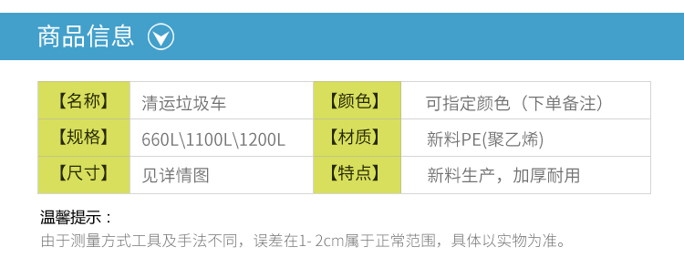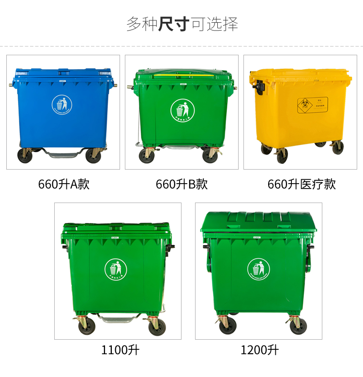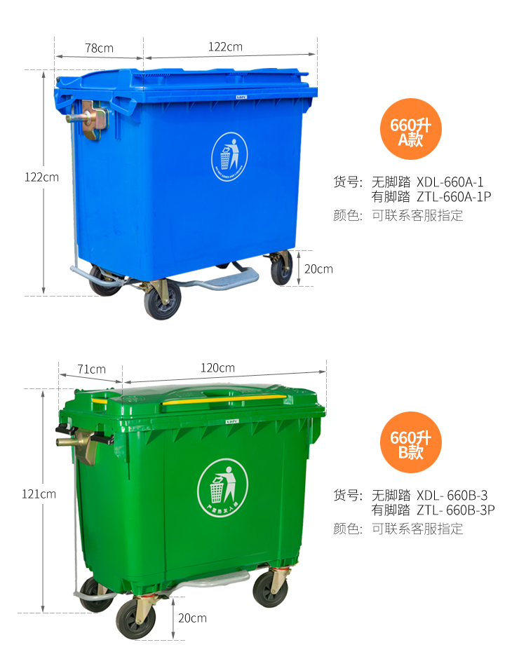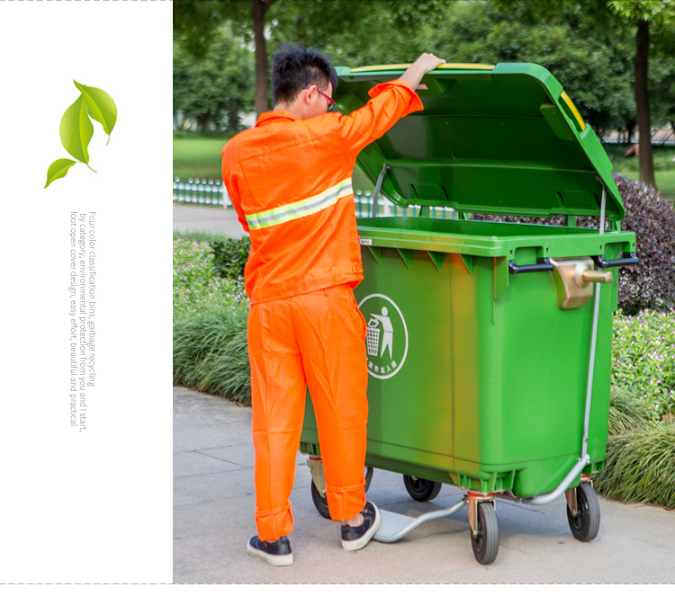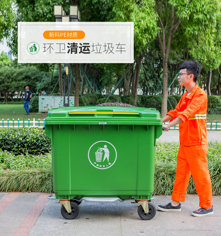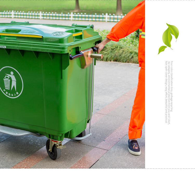 尺寸: 104*108*120CM 货号: ZTL-1100A-1 名称: 环卫垃圾车手推清洁车有脚踏 重量: 57KG 规格: 绿色1100L
