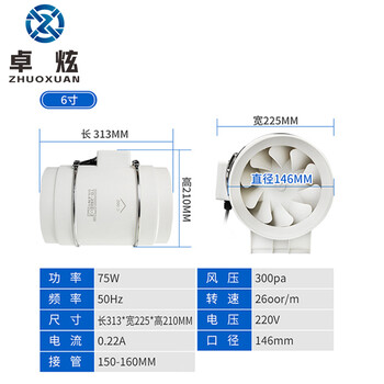 卓炫 斜流增压圆形管道风机排风扇换气扇送风工业抽风机 6寸白色