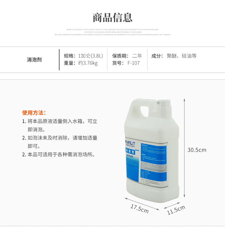 芳菲丽特(FOFILIT)F-107 消泡剂 地毯吸水机水箱消泡化泡剂 工业污水处理消泡 3.8L*4瓶