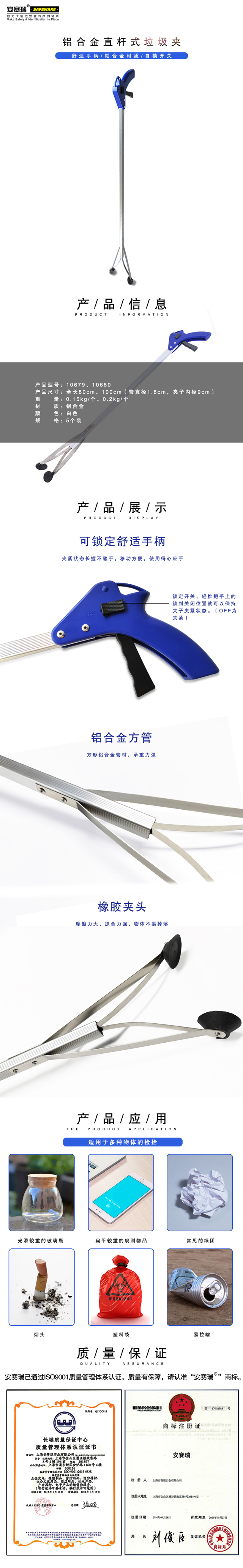 安赛瑞 商用铝合金直杆垃圾夹 环卫保洁长柄垃圾钳 铝合金直杆式取物器清洁工具长80cm(5把装)10679