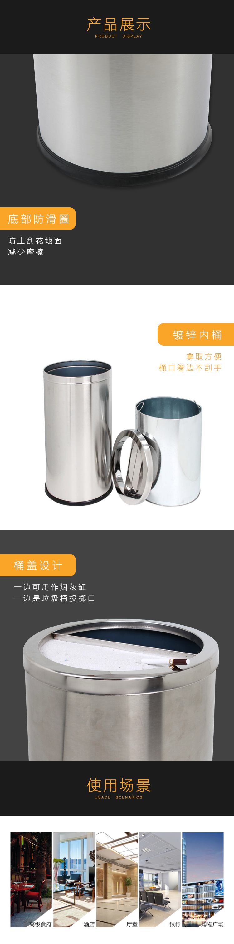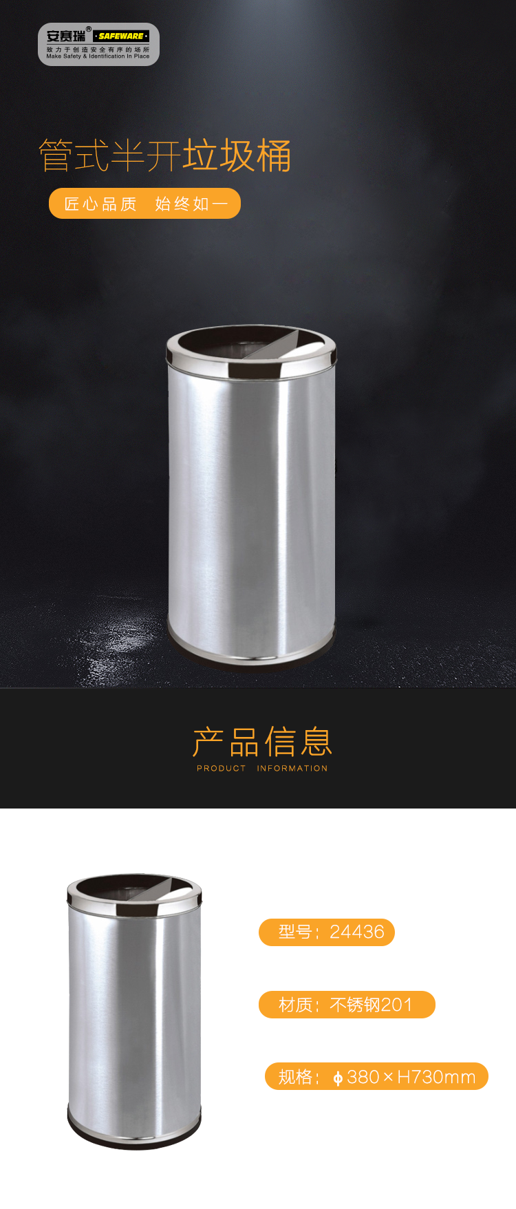 安赛瑞 不锈钢半开垃圾桶 38×73cm 酒店商场烟灰桶 港式圆形半开口立式垃圾箱果皮桶 24436