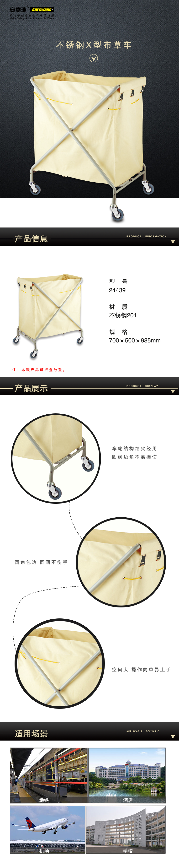 安赛瑞 布草车 不锈钢X型折叠清洁车 酒店宾馆客房手推收集车 洗衣房收纳车保洁车 24439