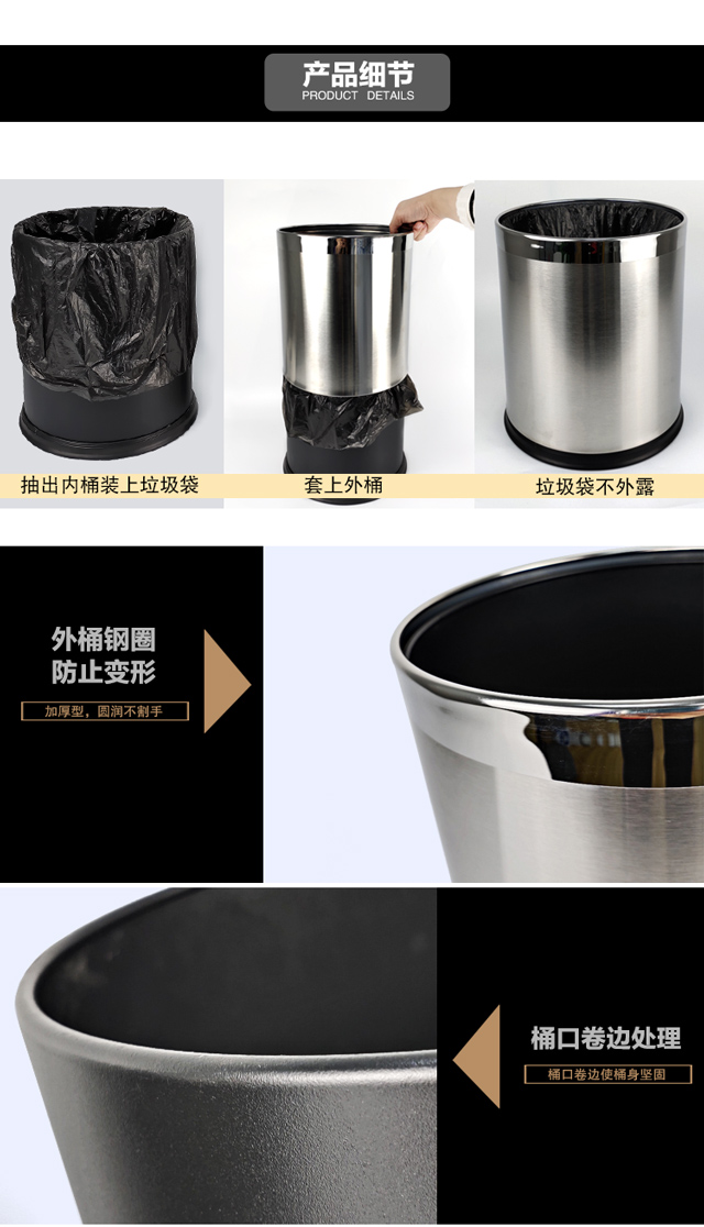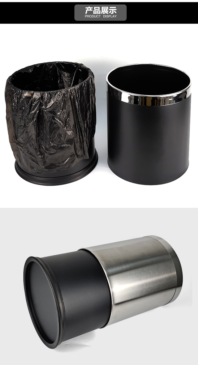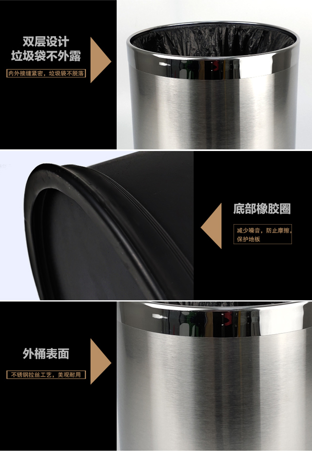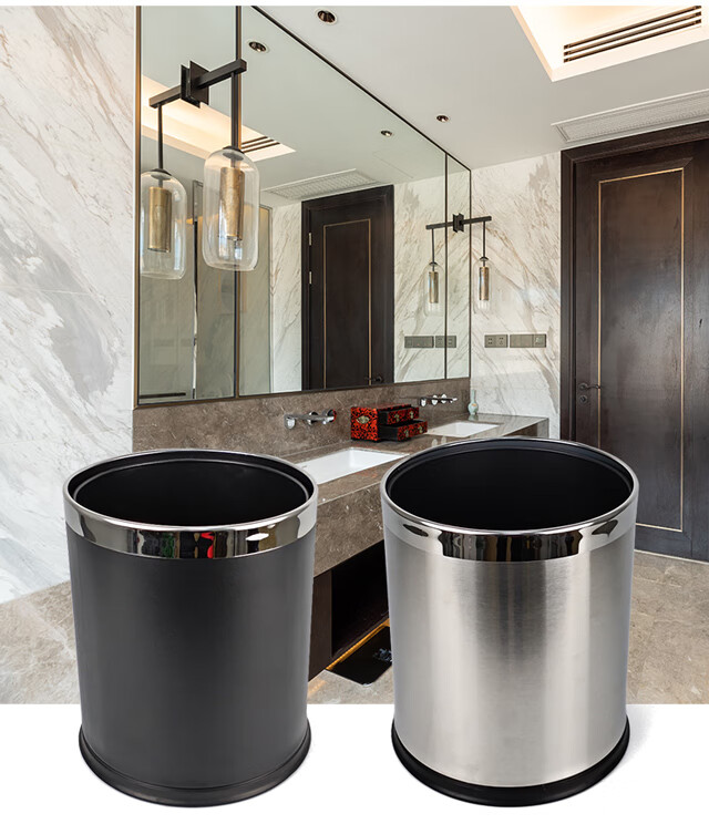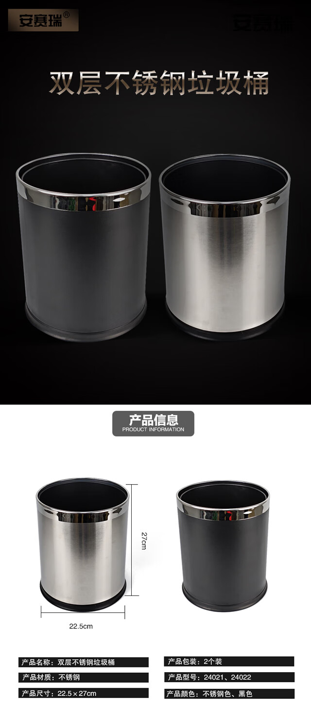 安赛瑞 双层不锈钢垃圾桶 酒店宾馆办公室钢圈垃圾箱 双层砂纹钢 2个装 10L 24021