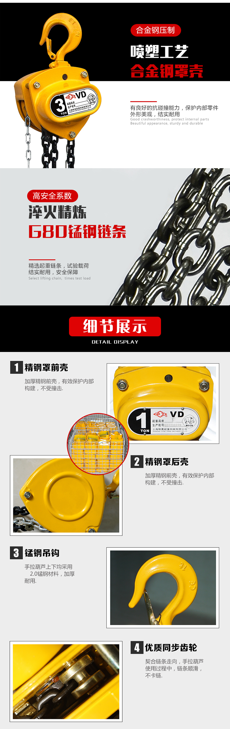 沪工 双轴承手拉葫芦 2T×9M VD型起重吊装小型倒链铁葫芦 三角型手动葫芦 2吨9米 24917