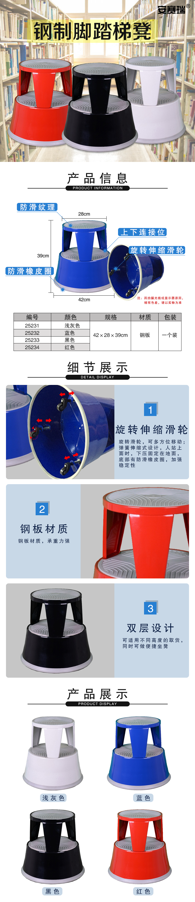 安赛瑞 钢制脚踏梯凳 理货凳超市取货凳登高凳 图书馆洗车移动梯凳 多功能仓库可移动脚踏圆凳 黑色 25233