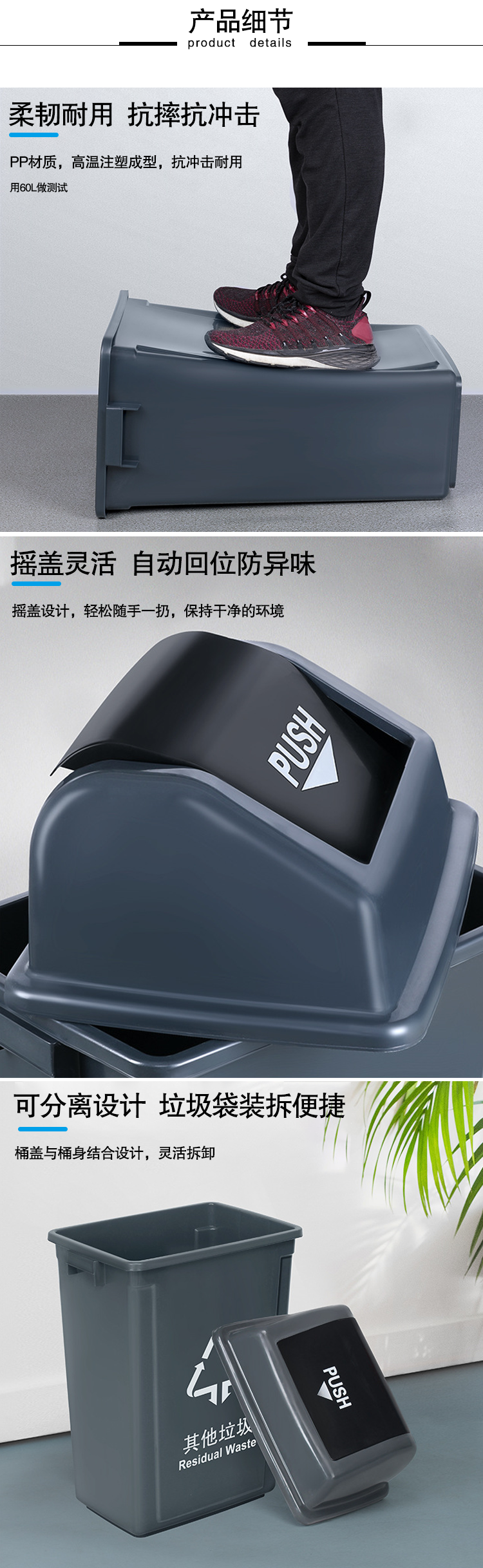 安赛瑞 摇盖垃圾分类垃圾桶 新国标加厚环卫户外果皮垃圾箱 灰色 其他垃圾 60L 27261