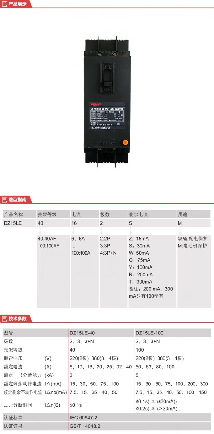 德力西电气 漏电塑壳断路器 2DZ15LE-100/2901 100A 100mA