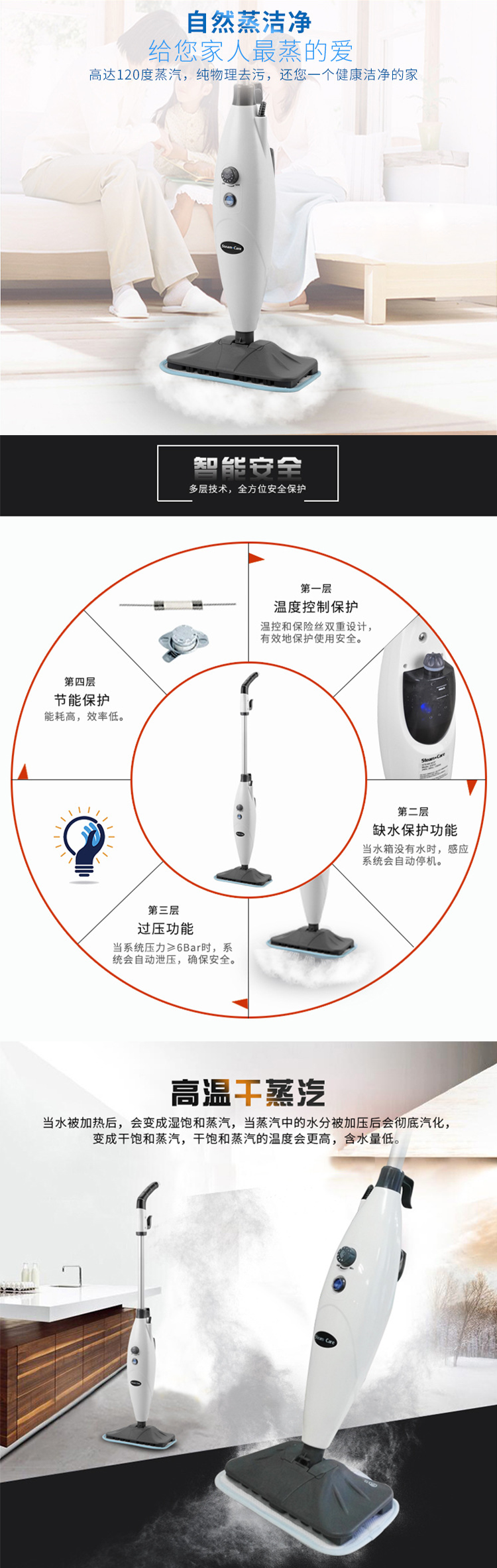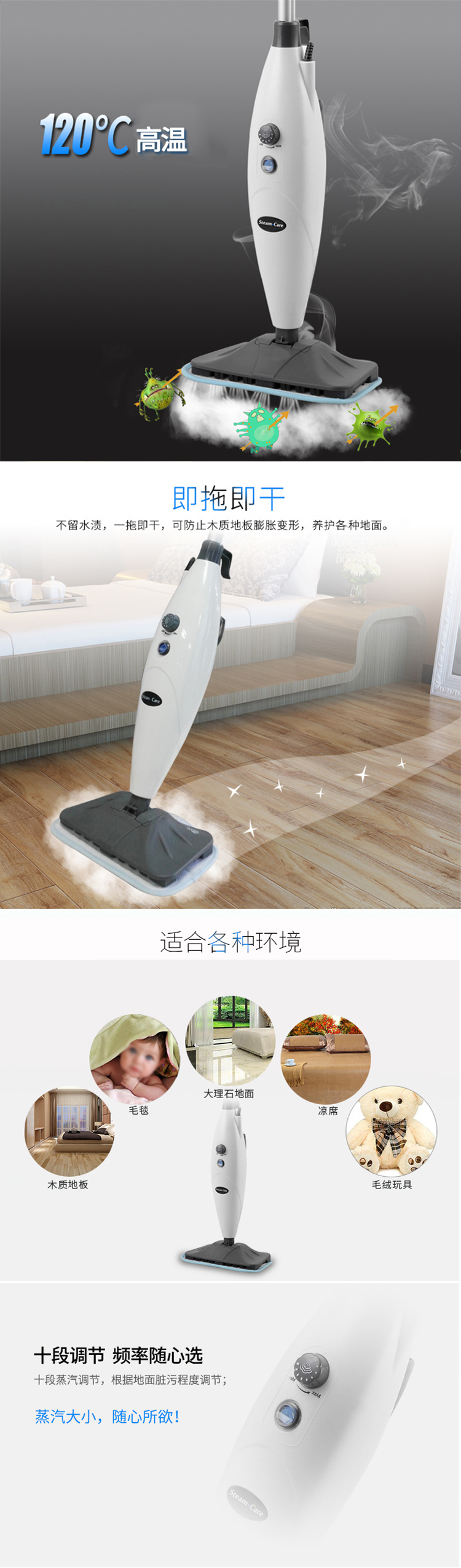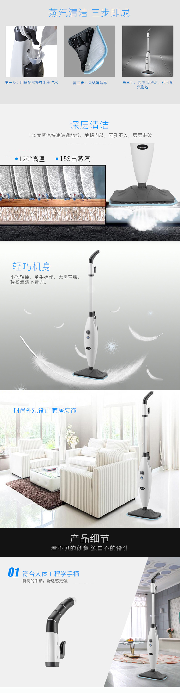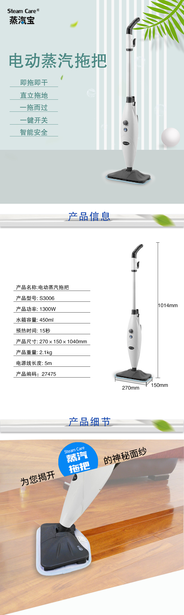 蒸汽宝SteamCare 高温蒸汽拖把 清洁机手持便携拖地擦地机 非无线电动 S3006 27475