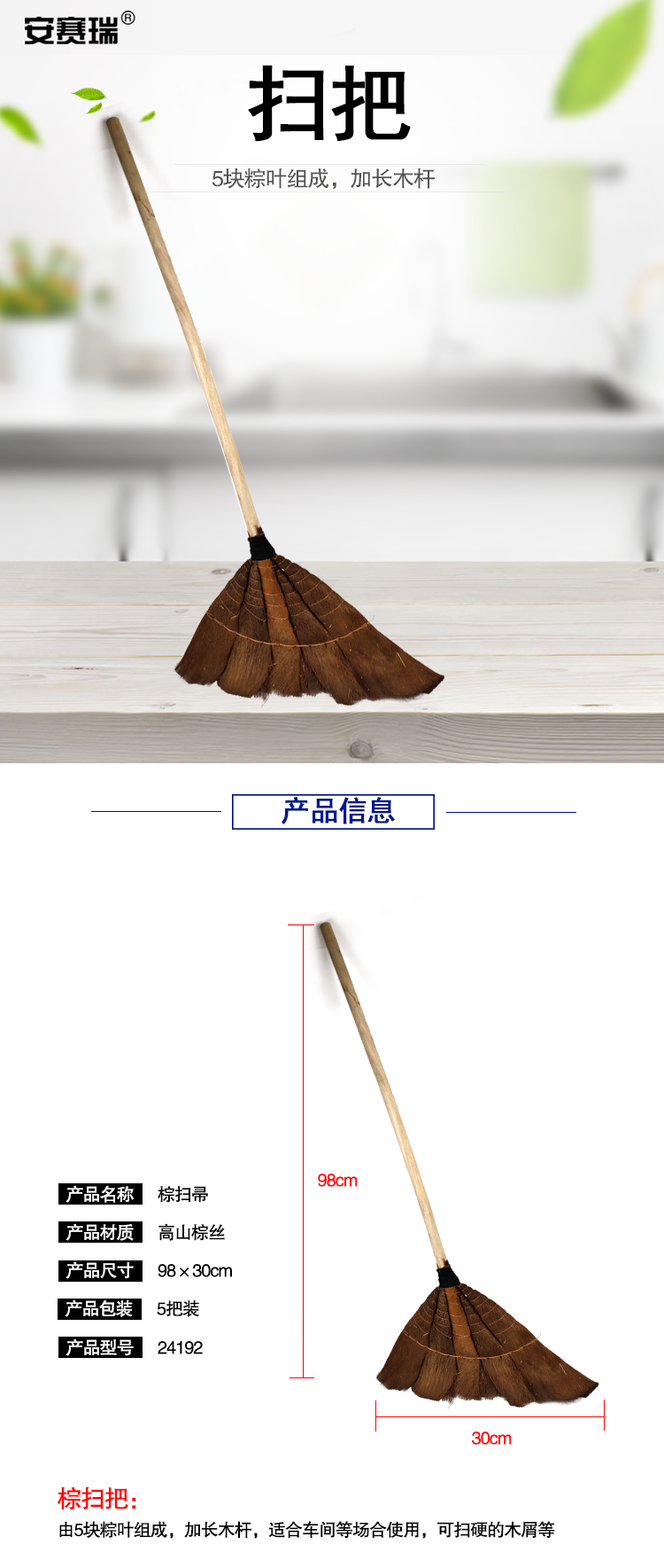 安赛瑞 棕扫帚 物业环卫扫帚笤帚清洁工具 (5把装)扫雪工具 工业用棕扫把 木柄棕树皮扫把24192
