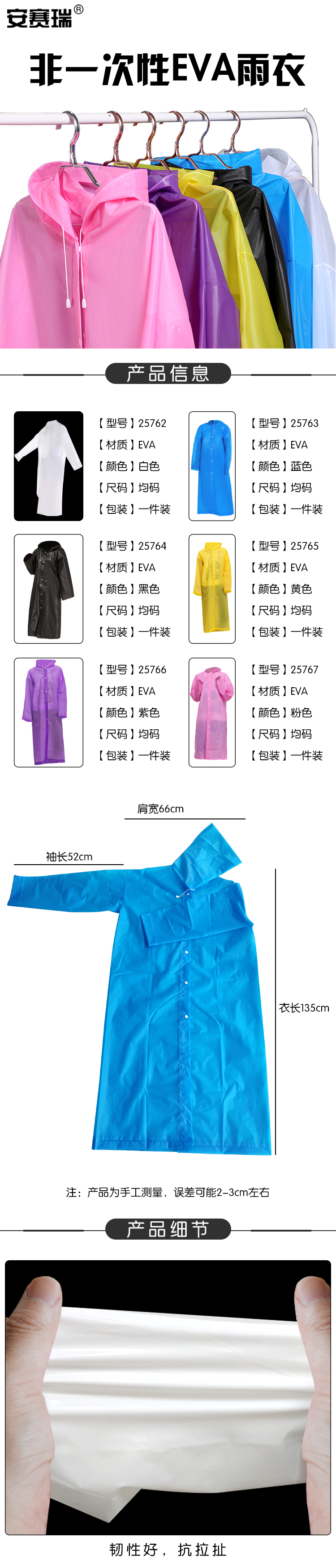 型号 25762 非一次性EVA雨衣 EVA 白色 均码 型号 25763 非一次性EVA雨衣 EVA 蓝色 均码 型号 25764 非一次性EVA雨衣 EVA 黑色 均码 型号 25765 非一次性EVA雨衣 EVA 黄色 均码 型号 25766 非一次性EVA雨衣 EVA 紫色 均码 型号 25767 非一次性EVA雨衣 EVA 粉色 均码