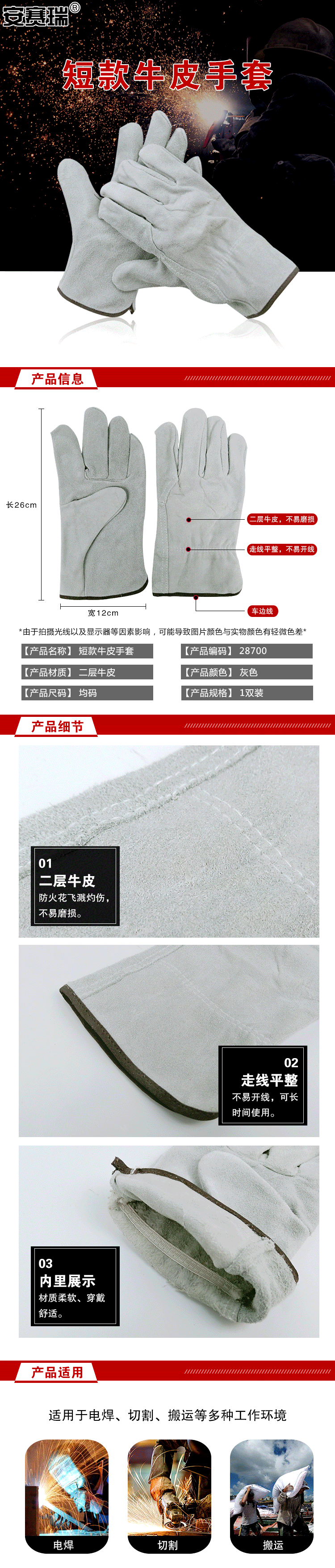 安赛瑞 短款牛皮手套 焊工电焊手套 隔热耐磨加厚劳保手套 灰色 均码 1双装 28700