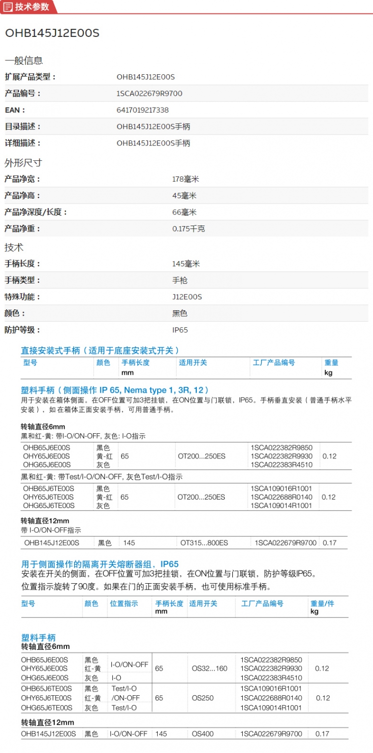 ABB 隔离开关附件 手柄 OHB145J12E00S 10114147