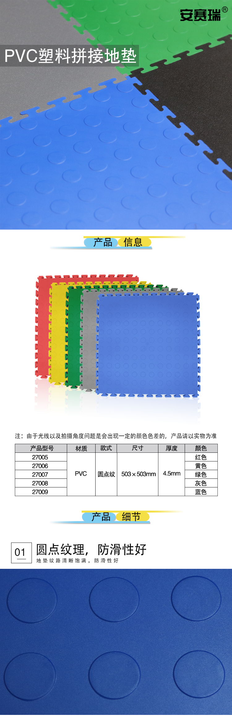 安赛瑞 PVC塑料拼接地垫 50×50cm 仓库车间走廊橡胶防滑地垫 黄 圆点纹27006