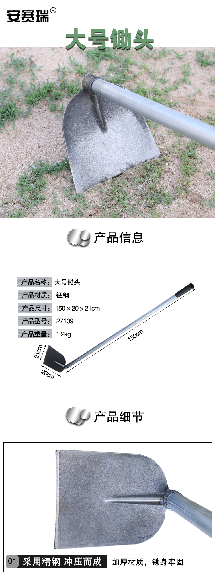 安赛瑞 全钢锄头 1.5米椿木户外开荒开山挖土大号钢制锄头 翻土除草种花农具 27109