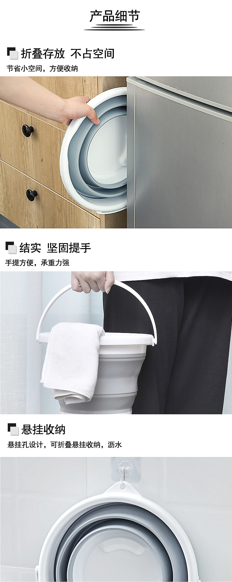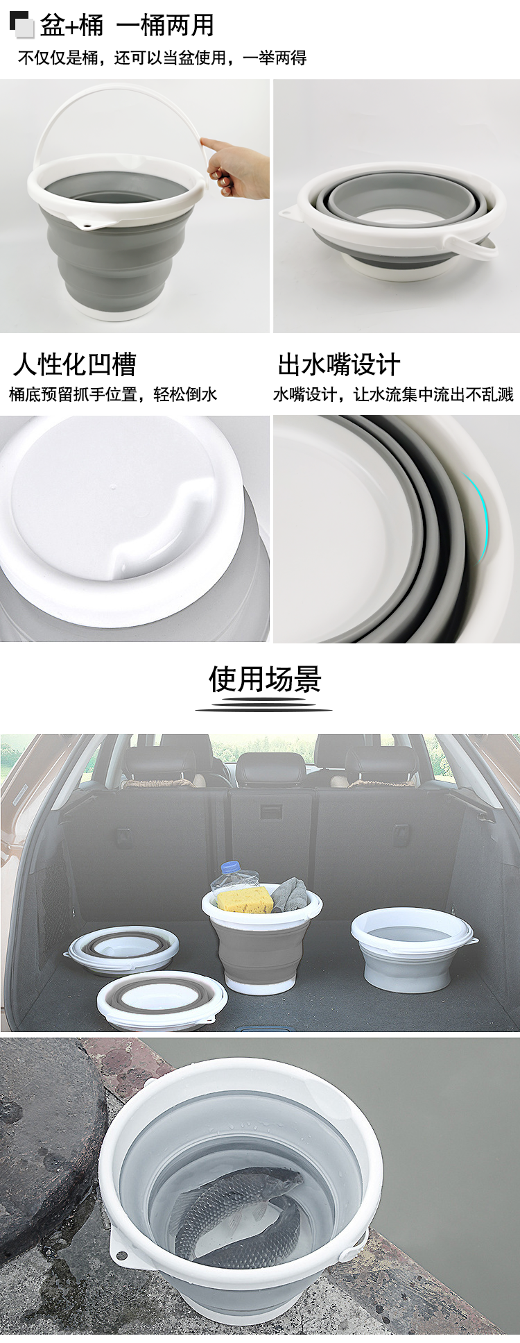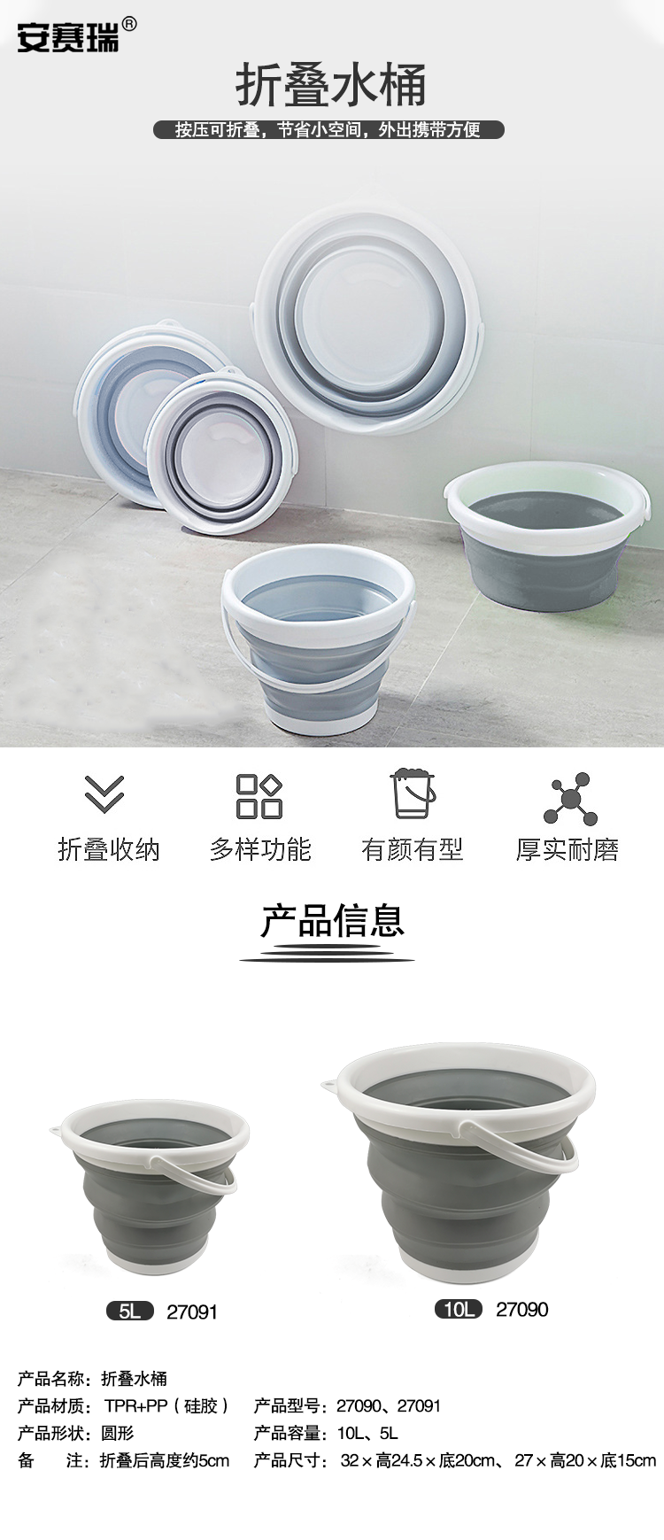 安赛瑞 折叠水桶 塑料桶 5L 多功能清洁折叠水桶 便携式户外储水桶洗车桶 灰色27091