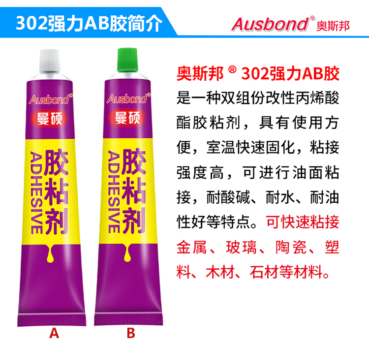 奥斯邦(Ausbond)302强力AB胶粘瓷砖石材金属铁塑料焊接胶耐高温沾陶瓷木头木工修补剂粘合剂石头胶水80克