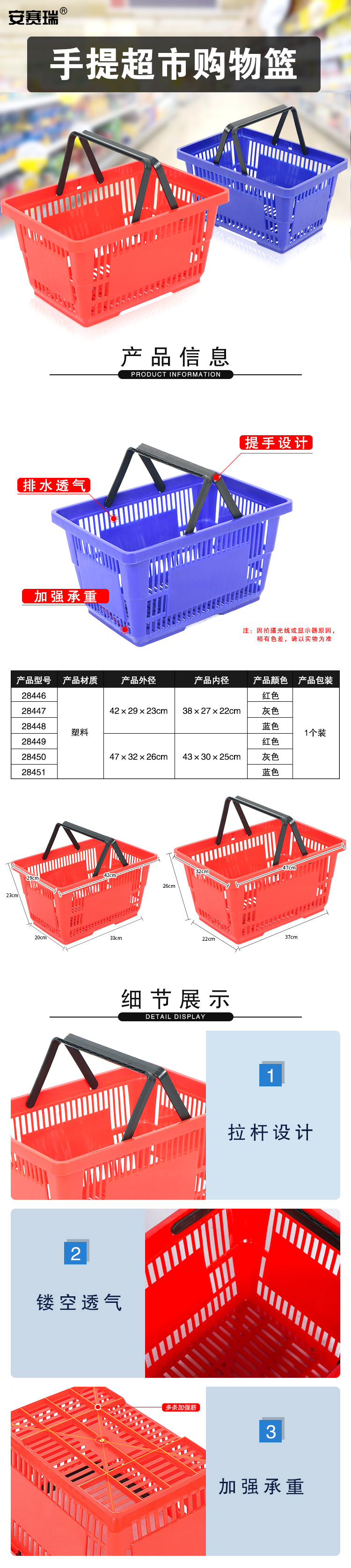 安赛瑞 手提超市购物篮 大号便利店卖场手提篮收纳篮买菜筐 内径43×30×25cm 蓝 28451