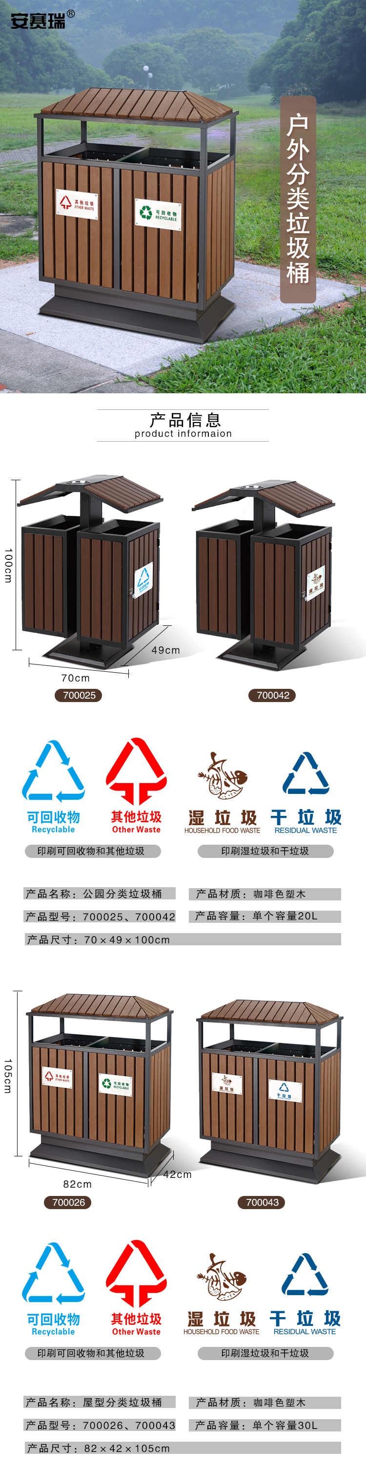 安赛瑞 户外分类垃圾桶 公园景区钢木垃圾桶 20L×2 户外分类垃圾箱市政环卫果皮箱垃圾箱室外700025