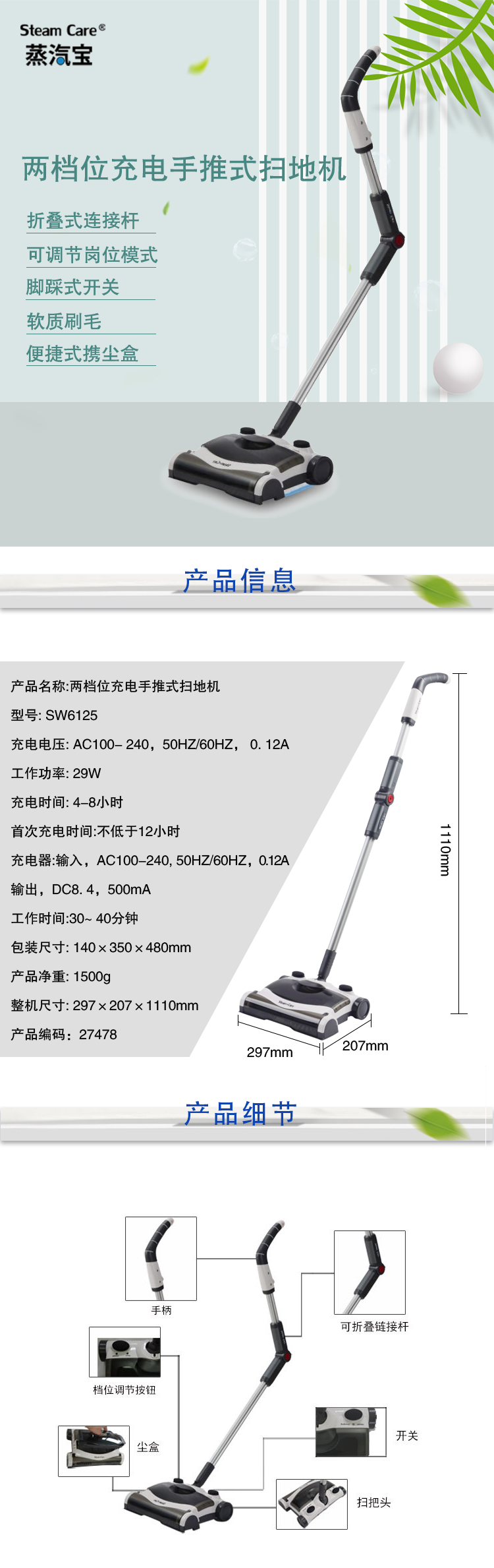 蒸汽宝SteamCare 无线电动拖地机 充电扫地机 可折叠手推式清洁吸尘器 SW6125 27478