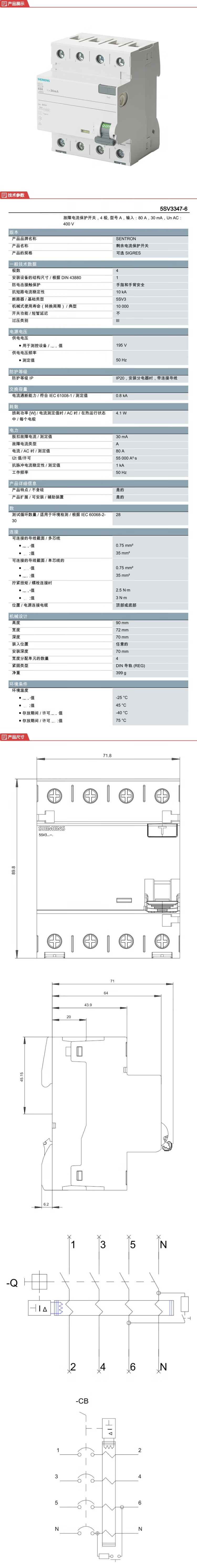 西门子 电磁式剩余电流保护开关 5SV3 A 30mA 80A 4P