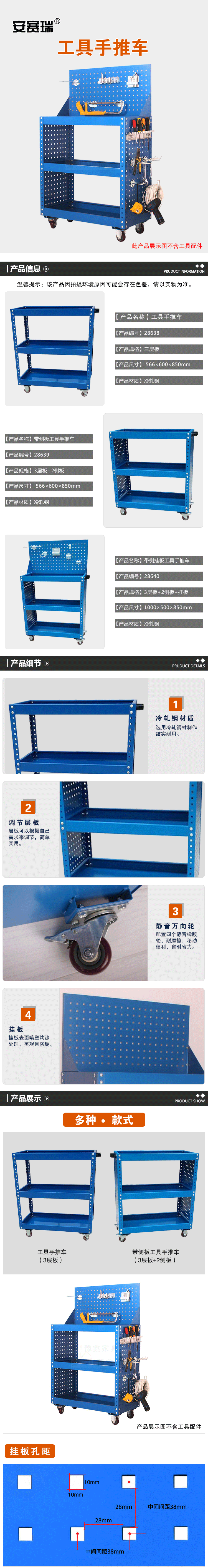安赛瑞 工具手推车 汽修维修工具车 多功能五金零件车维修移动车 工具架子层 800×400×950mm 28638