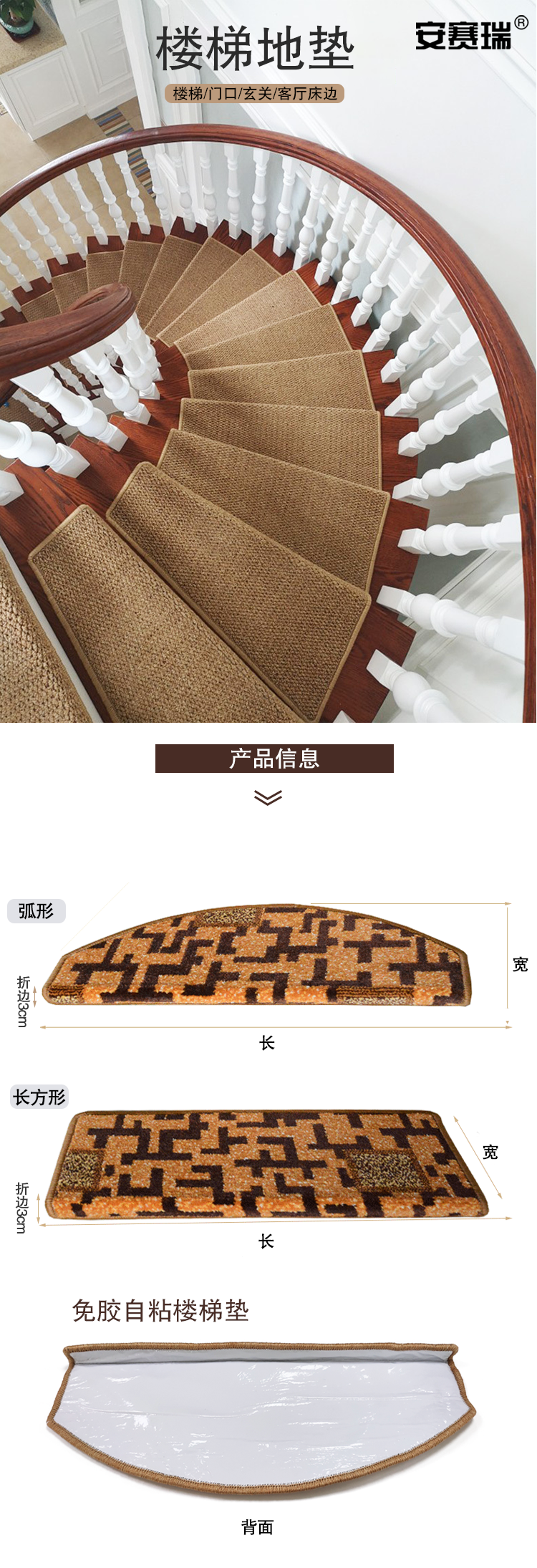 安赛瑞 楼梯地垫 木楼梯地垫 75×24×3cm 免胶自贴楼梯防滑踏步垫 实木地毯 长方形 咖啡色700614
