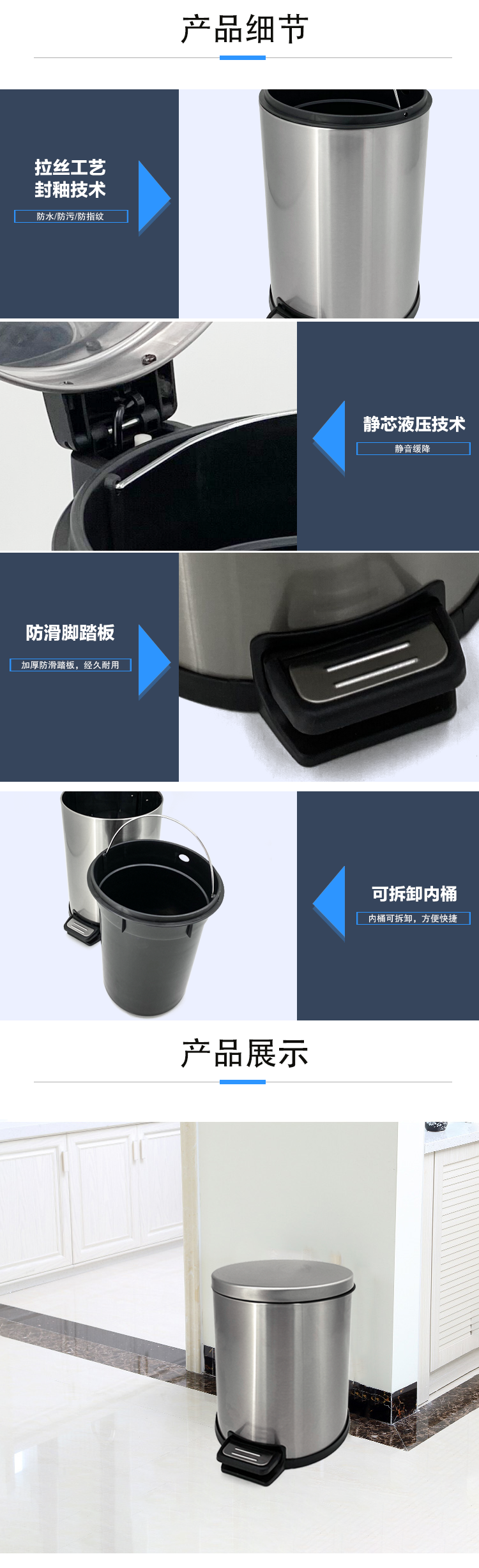 安赛瑞 不锈钢脚踏垃圾桶 8L分类圆形翻盖商用垃圾桶 缓降低噪音带盖垃圾篓700242