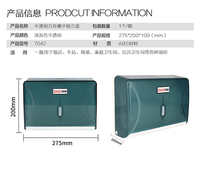 斯图酒店卫生间纸巾盒商场擦手纸巾架抽纸盒挂式抽纸架 7042半透明方形纸巾盒