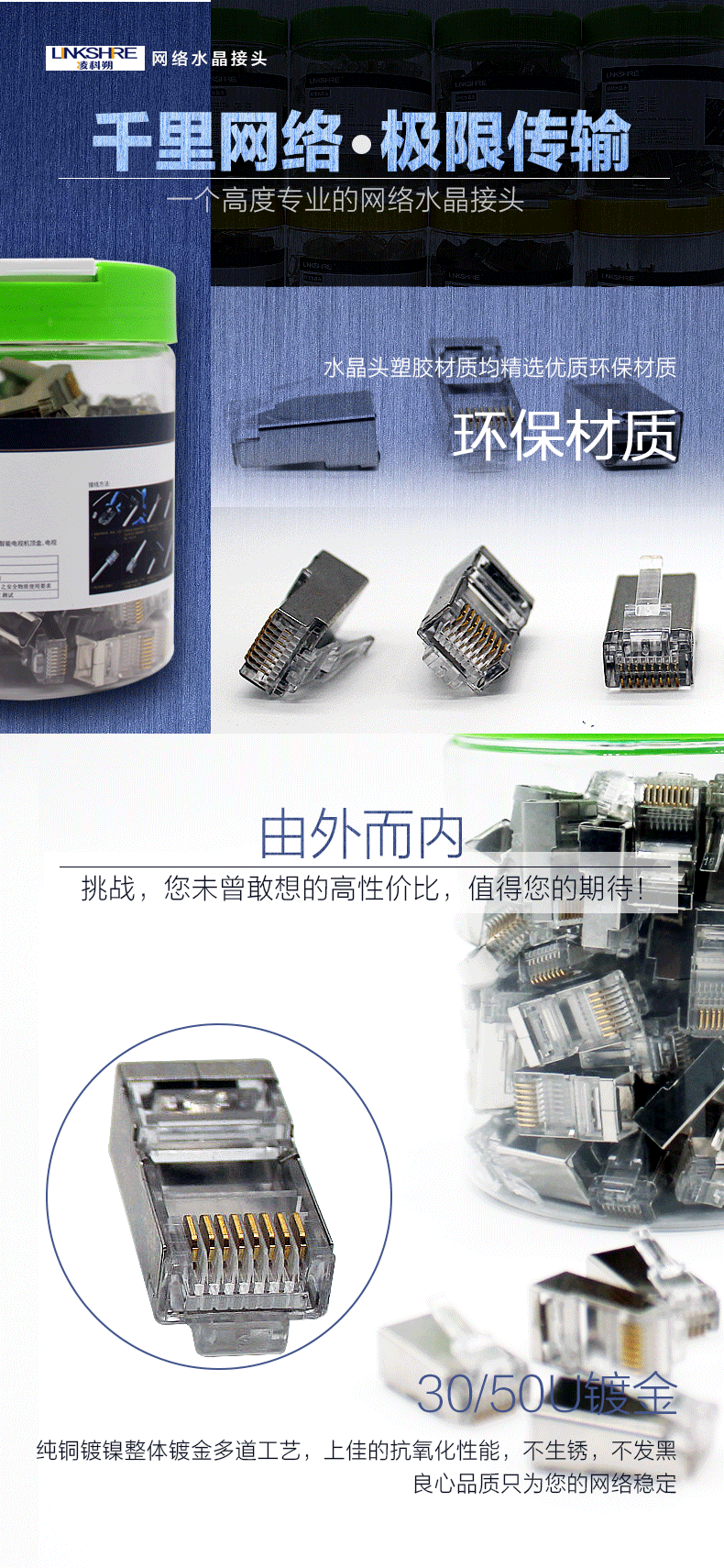 凌科朔(LINKSHIRE)五类水晶头 5类工程级RJ45网络水晶头 非屏蔽