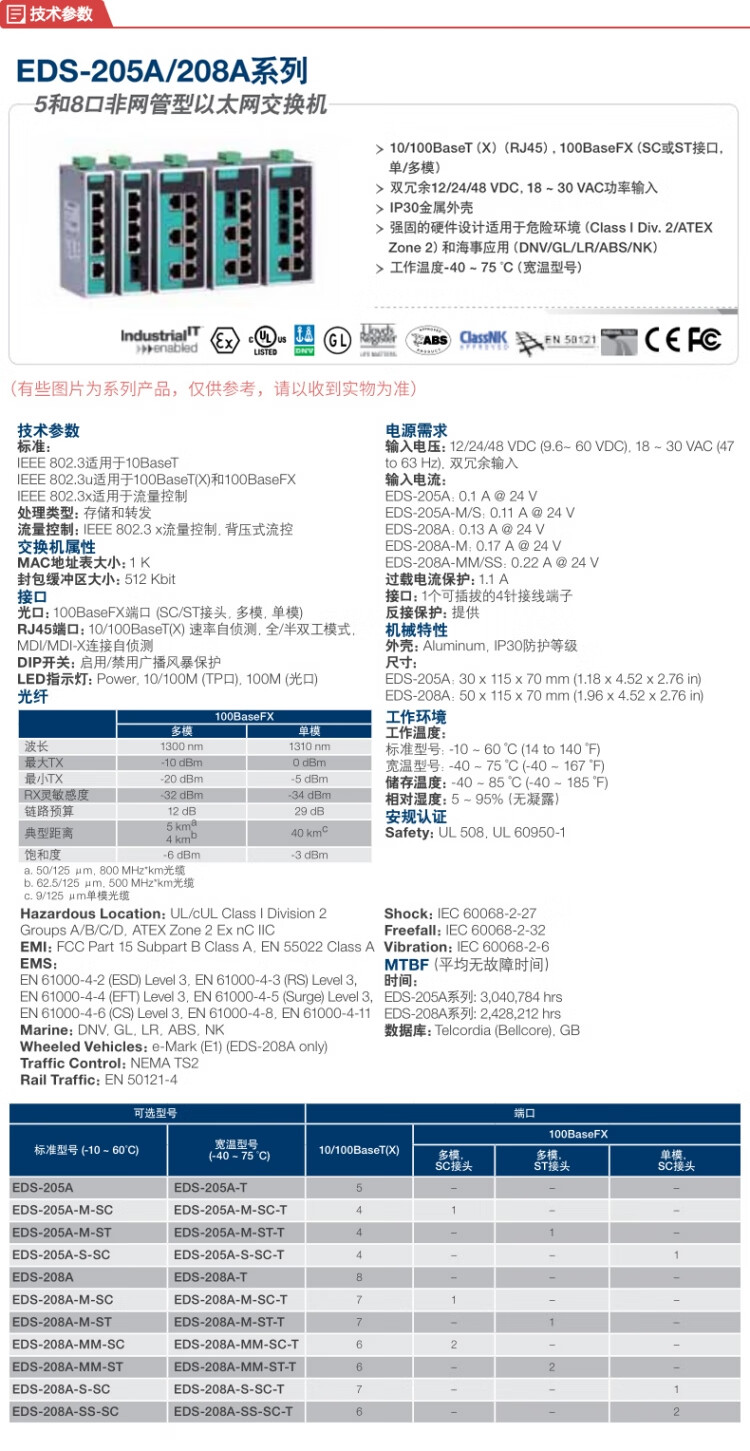 摩莎(MOXA)EDS-208A-M-SC 8口非网管百兆工业以太网交换机含一个多模光口