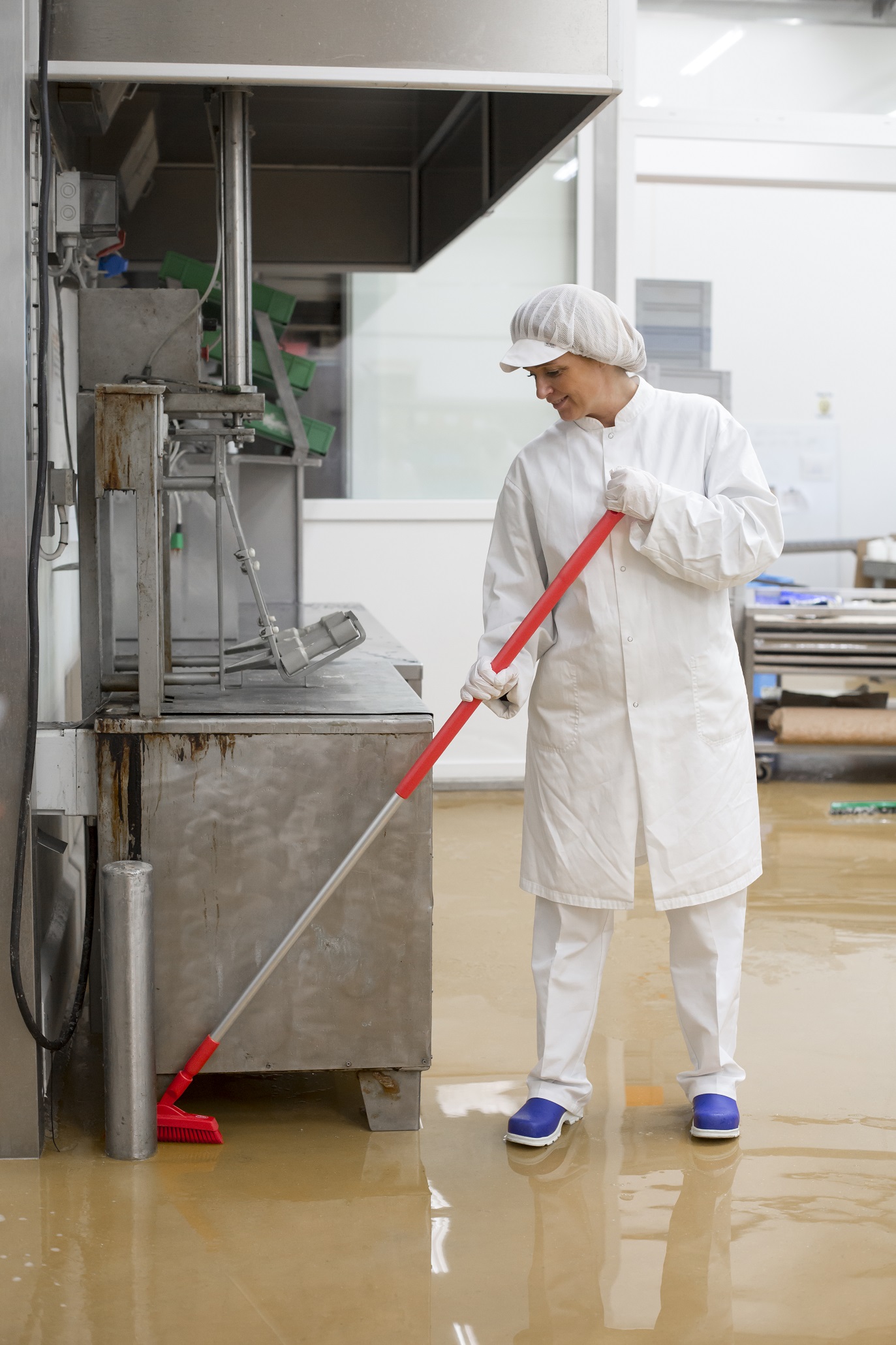 利用不同角度刷洗设备底部地面,墙角。