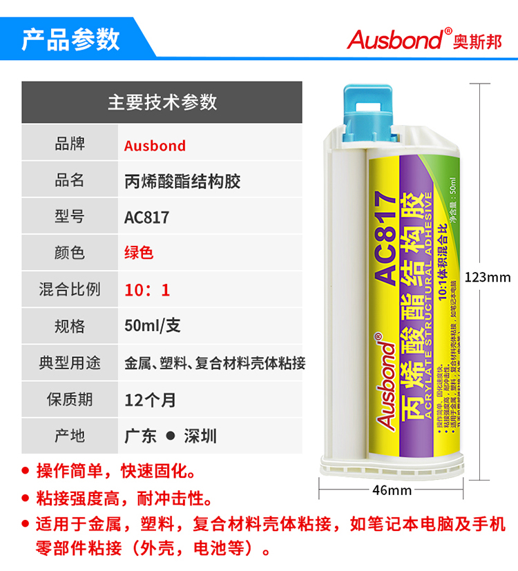 奥斯邦(Ausbond)AC817丙烯酸酯结构胶粘金属塑料双组份AB胶水手机平板后壳笔记本铝合金外壳粘结剂50ml