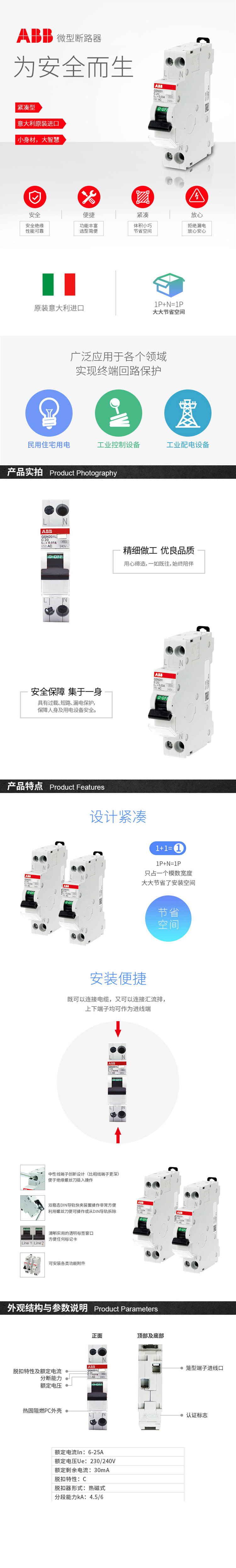 ABB漏电保护器 1PN 10-25A空气开关带漏保DPN双进双出进口GSN201L 1P+N C25A漏电保护器