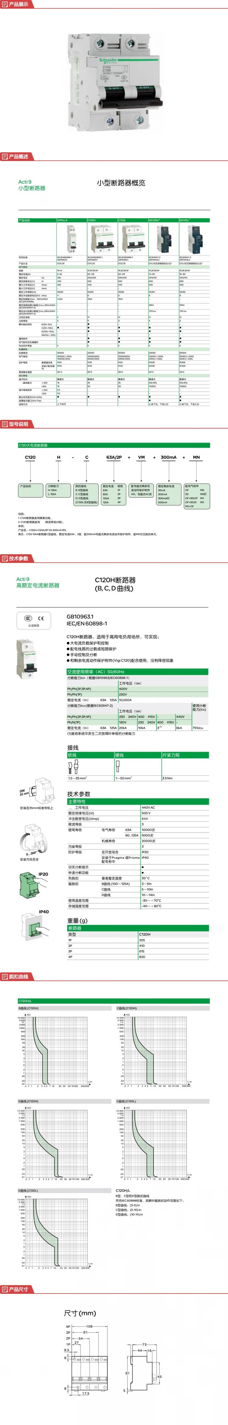 施耐德空气开关A9系列C120H大电流断路器 3P三相电 C型63A 10KA总闸空开断路器
