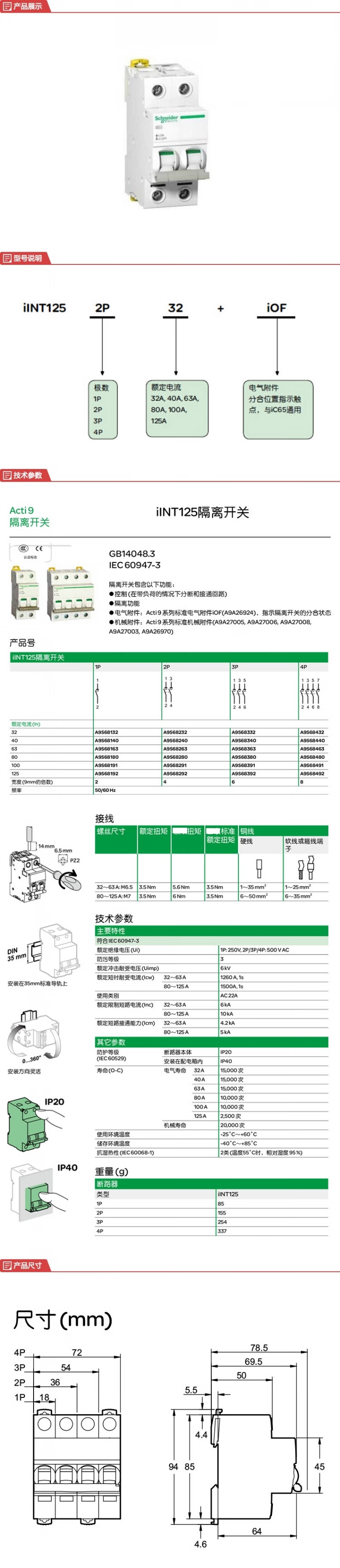 施耐德空气开关A9系列C120H大电流断路器 3P三相电 C型63A 10KA总闸空开断路器
