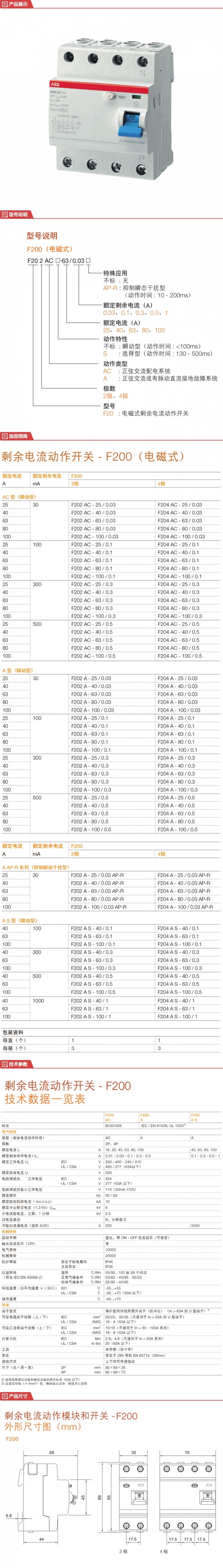 ABB F200系列不带过电流保护的剩余电流保护器;F204 A-63/0.3