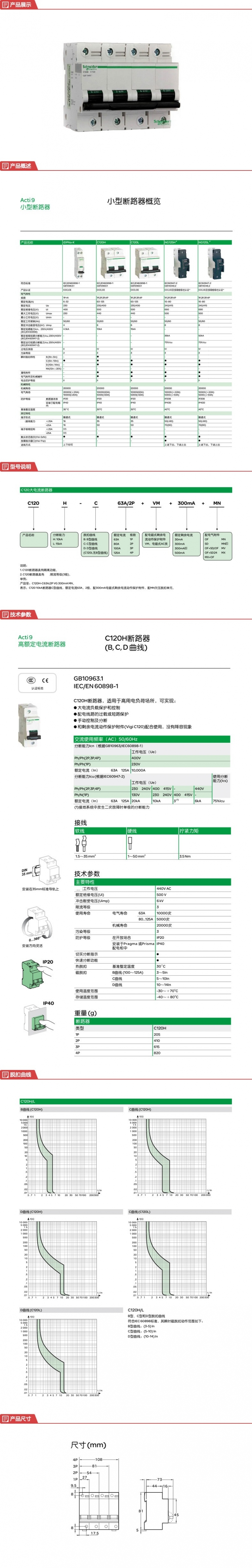 施耐德空气开关A9系列C120H大电流断路器 3P三相电 C型63A 10KA总闸空开断路器