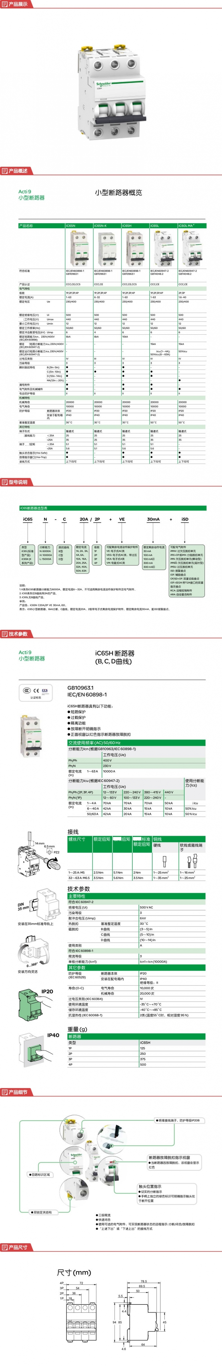 施耐德电气 小型断路器 空气开关 A9系列 iC65H-C40A 2P 10kA 单位:个 货号A9F29340
