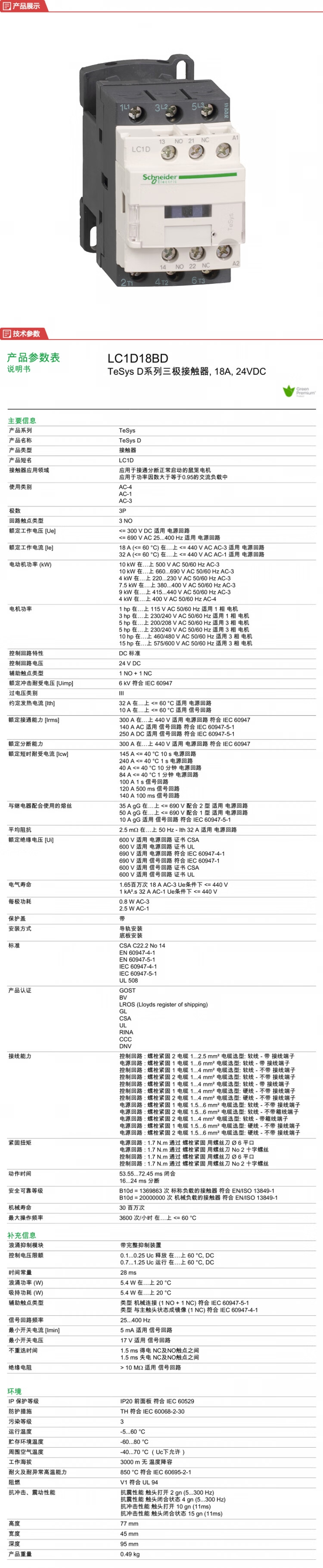 施耐德 进口TeSys LC1D系列三极直流接触器 18A 24VDC;LC1D18BD