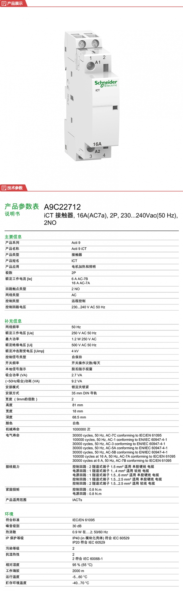 施耐德电气 接触器 标准接触器 iCT 2NO 230~240V 16A A9C22712