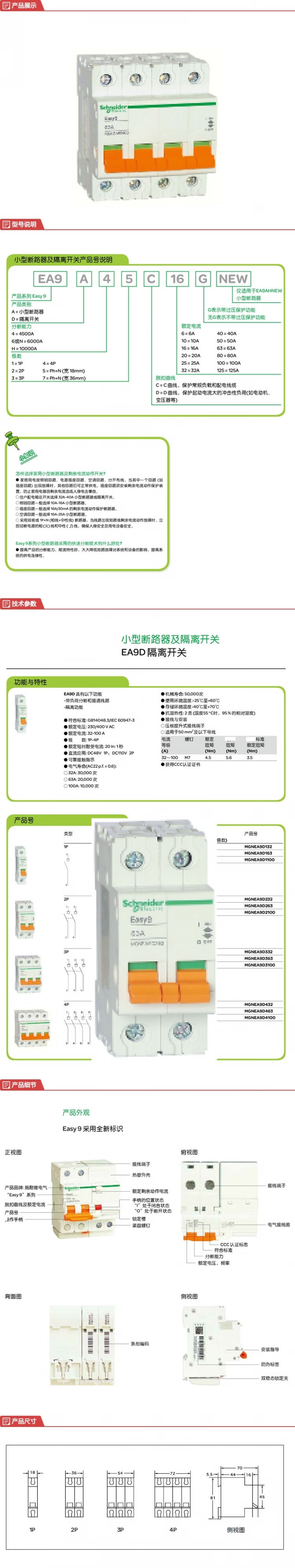 施耐德空气开关断路器EA9系列 EA9AN 空开 EA9AN3C32 三相电3P C32A