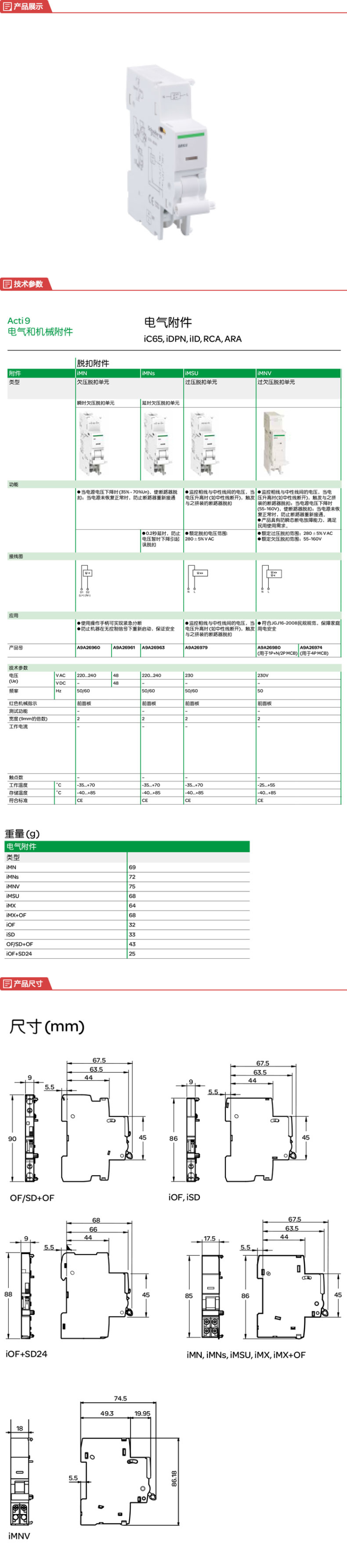 施耐德 电气附件 iMNV适用于1P+N/2P MCB(iC65 iDPN iDPNK2);A9A26980