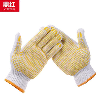 鼎红防滑点塑点珠点胶手套 耐磨点塑纱线手套防滑棉纱工作手套工人干活作业防护点胶手套 黄色点塑手套24双