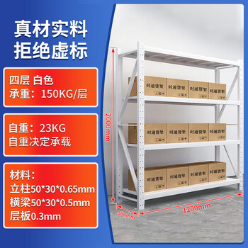 时通货架仓储置物架多层货物展示架超市钢制储物架仓库阳台铁货架子轻型150KG白色1200*500*2000mm四层主架