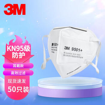 3M KN95口罩 9501+ 耳戴式自吸过滤式防颗粒物呼吸器 环保装50个/包